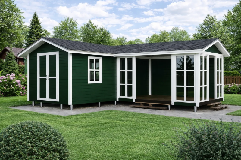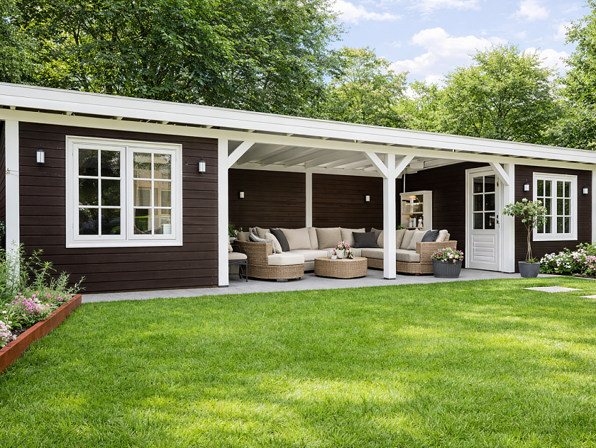 Габариты: 3×9 + навес 1,5×3 м. Площадь: 27 м²