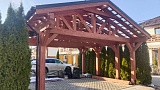 Навес для автомобилей Аларес — это функциональное и сбалансированное решение для защиты двух транспортных средств на компактной территории. Габариты 6,6×5,1 м и площадь 34 м² позволяют разместить автомобили с удобными проходами и достаточным пространством для открывания дверей, не занимая лишнюю землю на участке. Коньковая крыша с двумя скатами обеспечивает эффективный водоотвод и предотвращает скопление снега, что особенно важно в условиях частых осадков. Каркас выполнен из высококачественной хвойной древесины, прошедшей камерную сушку, что исключает деформации и гарантирует долговечность строения. Отсутствие хозблока делает всю полезную площадь доступной для парковки, а грамотная конструкция позволяет органично вписать навес в любой ландшафт. Кровельное покрытие из битумной черепицы "Shinglas" обеспечивает надежную защиту от осадков и придает навесу законченный вид.