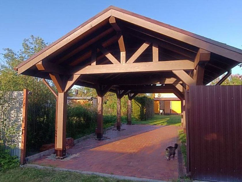Деревянный навес на загородном участке – очень полезное, а порой и незаменимое сооружение. Он подходит для разных целей: для парковки автомобиля, обустройства зоны отдыха, хранения садового инвентаря, в качестве пристройки к дому. Помимо основного назначения, навес из дерева, как правило, выполняет декоративную функцию, создавая гармонию с домом и окружающей природой. Среди достоинств уличных деревянных конструкций: